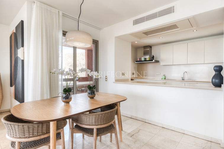 De open, volledig uitgeruste keuken sluit naadloos aan op de woonkamer en creëert zo een ruim en modern geheel. Vanuit de keuken is er directe toegang tot het terras met een gezellige eethoek in open lucht, ideaal om het hele jaar door te genieten van het aangename klimaat en het prachtige uitzicht.